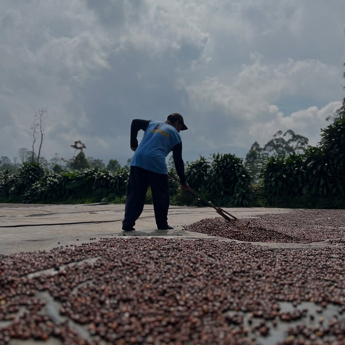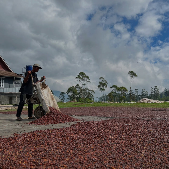 Finca de Berman is located in the highlands of West Java. Led by Mr. Diki, a Cup of Excellence winner & Don Aman, a much respected elder farmer in the region. Mr. Diki experiments with many processing methods, this one uses carbonic maceration. Coffee cherries are floated to remove defects & immature cherries, dry fermented for 24 hours, paced in sealed tanks which are then filled with carbon dioxide to create a low oxygen environment & finally placed on drying patios until the moisture has reduced to 11%. The results are increased body & ripe fruit fours.